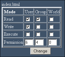 permission types. 1. set plain html pages to rw- for the user, no permission for the group, and r--for world (default) 2. set scripts to rwx for the user, r-x for the group, and r-x for world 3. set data/config files to rw- for the user, no permission for the group, and rw- for world Select "Change" to finish.