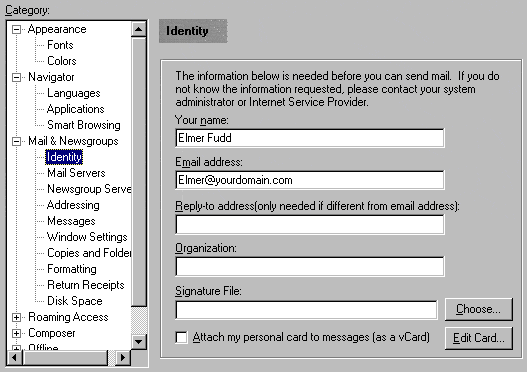 3. From the "Left Menu" select "Mail and Newsgroups", then click the + symbol, which displays a list of options. Select "Identity." Enter the "email address" of the account you're setting up, and "your name" as demonstrated in the following example: