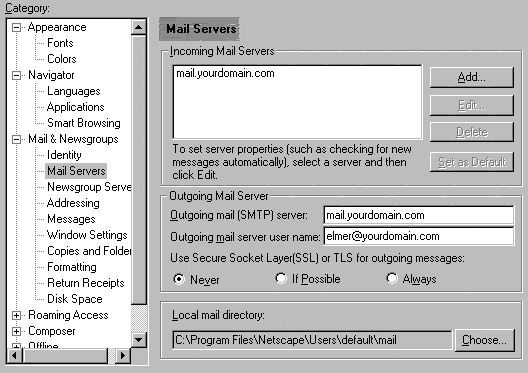 That's pretty well it! Close your account settings and test out your new address by sending a message to it. If you're able to send a message, and receive that same message in your new account, then congratulations! - you've successfully setup your first email account on our servers. Potential problems with sending mail: 1. Change the "SMTP Outgoing Mail Server" settings to the same ones as you're using on your ISP's email account. This information should be included with the setup instructions of your Internet account. If not, contact your ISP for their "Outgoing SMTP Mail Settings." 2. Once you've added your ISP's SMTP settings, remove the information in the "Outgoing Mail Server User Name" and leave it blank. DO NOT CHANGE ANYTHING ELSE! You can now receive mail from your domain account, while sending mail will be accomplished through your ISP's SMTP servers. This will in no way effect the performance or look of your email messages coming from your domain. Note: PLEASE DO NOT send large volumes of mailings through our SMTP Relay server. It's really provided as a courtesy to our users, and not something to be used for mass mailing list purposes. If you're sending large emails, or are running a mailing list, PLEASE use your ISP's mail server for this purpose. They are better setup for this sort of heavy duty usage, and you won't clog our SMTP server, which also needs to provide resources to other users.
