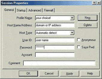 or IP address) -Remote Host Directory: /www Login Information The following information is contained within your account activation notice and is needed to connect you to your website via FTP: Your User Name........(case sensitive) Using WS_FTP Each time you run WS_FTP the Session Profile window will be displayed.